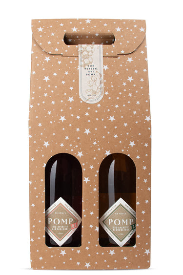 - Lieferumfang: 2 × 0,75 L POMP Bio-Aperitif 0,0 alkoholfrei in Kraftkarton-Geschenktasche „Stars“ mit Sichtfenster & Sternchen-Design
