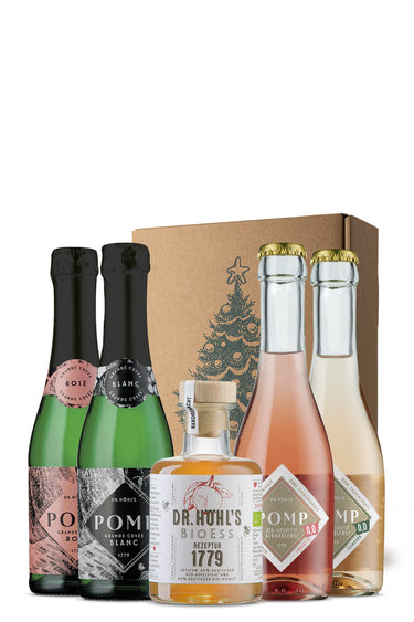 Lieferumfang: 4 x 0,2 L POMP Mini (davon 2 x ohne Alkohol), 1 x 0,2 L REZEPTUR 1779 im Weihnachts-Geschenkkarton „Frohe Weihnachten“. In unserem kleinen Genussgeschenkset enthalten sind: