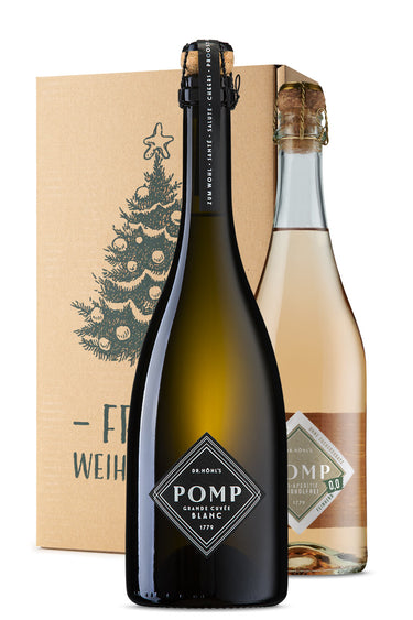 Entdecke das Weihnachtsgeschenkset mit zwei Flaschen feinstem Prickeln auf Gourmet Niveau. Unsere „Frohe Weihnachten“ Geschenkbox vereint die edle POMP Grande Cuvée Blanc und den feinherb-orientalischen POMP Bio-Aperitif 0,0 Feinherb mit 21 fein komponierten Bio-Botanicals und herber Gurke.