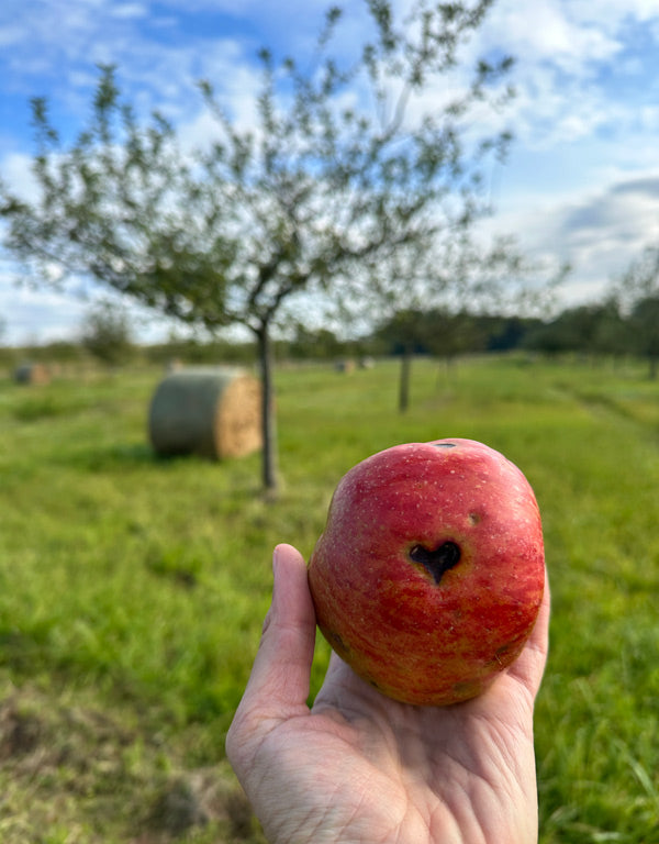 äpfel zu einem herz angeordnet auf einer gemähten streuobstwiese