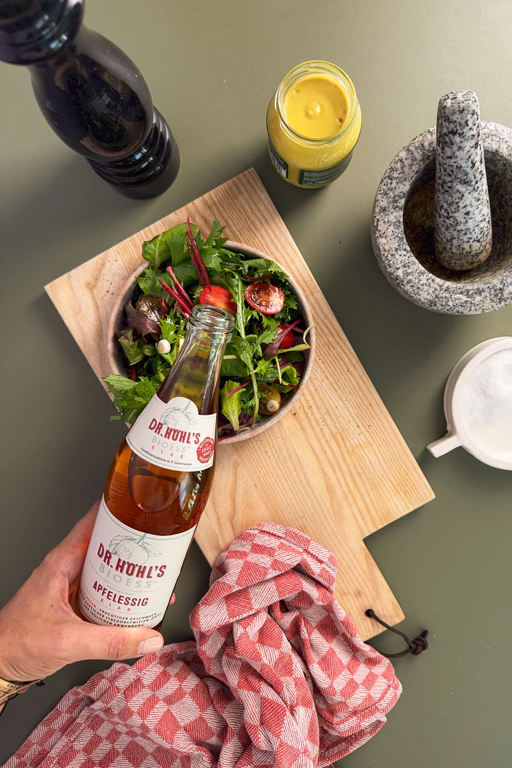 For a basic salad dressing that goes with any salad, mix 1 part BioEss apple cider vinegar with 2 parts cold-pressed rapeseed or olive oil. You can find more recipe ideas here in the blog .