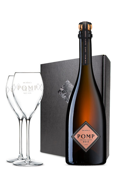 - Lieferumfang: 1 × 0,75 L POMP Grande Cuvée Rosé, 2 × Gläser mit POMP Branding in schwarzer Geschenkbox